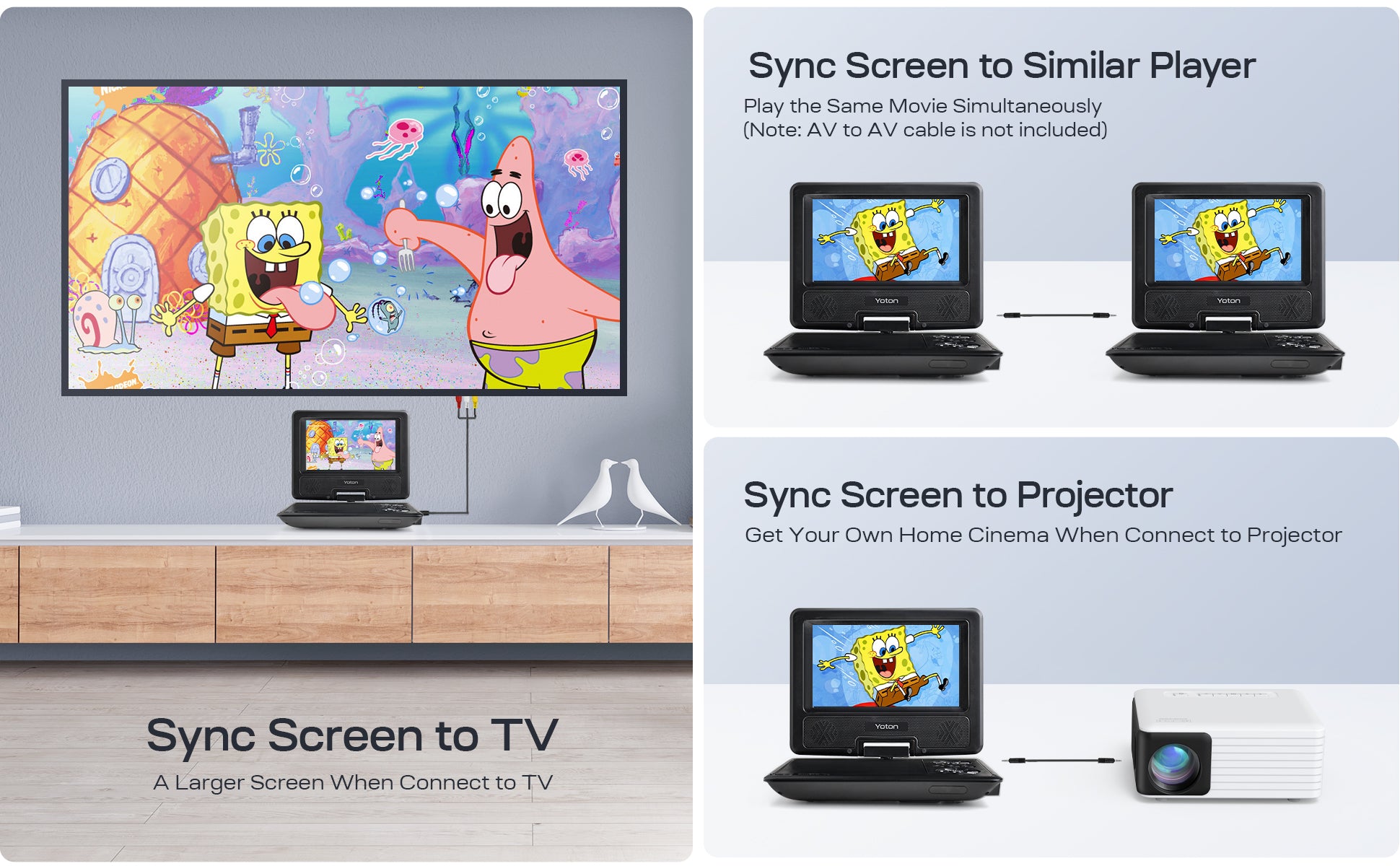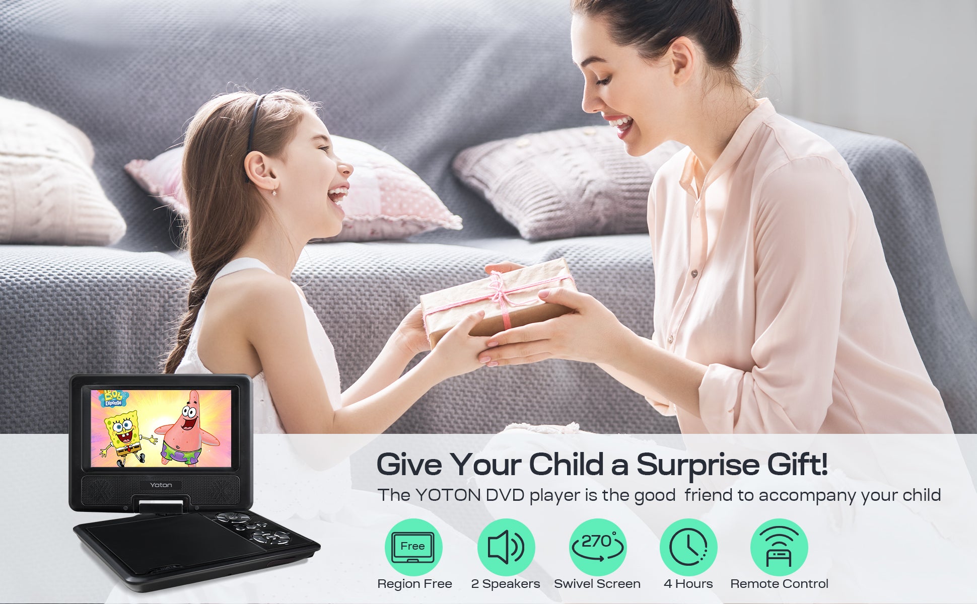 Our YOTON portable dvd player is equipped with dual stereo speakers, brings you sufficient sounds experience when you are watching movies.